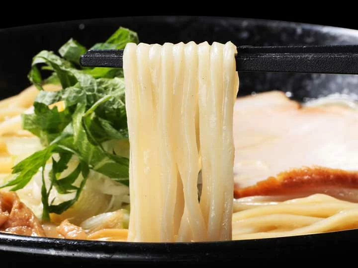 濃厚なスープの中でも小麦の旨味と香りが強い存在感を発揮できるように計算された特製麺はパツッとはじけコリコリな食感がたまらない。低加水の中細ストレート麺がスープをしっかり絡み上げる。また、穂先メンマや丁寧に低温調理された豚ロースのレアチャーシューもスープの旨味とばっちりマッチし、存在感も相性も抜群。店舗と同様に刻み大葉をトッピングすることで、濃厚なスープに負けず劣らず爽やかな清涼感が加わり重量感を中和。すべての調和がとれて、全体がまとまった一杯だからこそ、大葉、ネギ、刻み玉ねぎを加えてアレンジすることで多様なバリエーションの美味しさを楽しむことが可能。