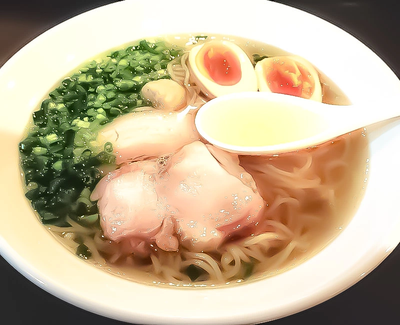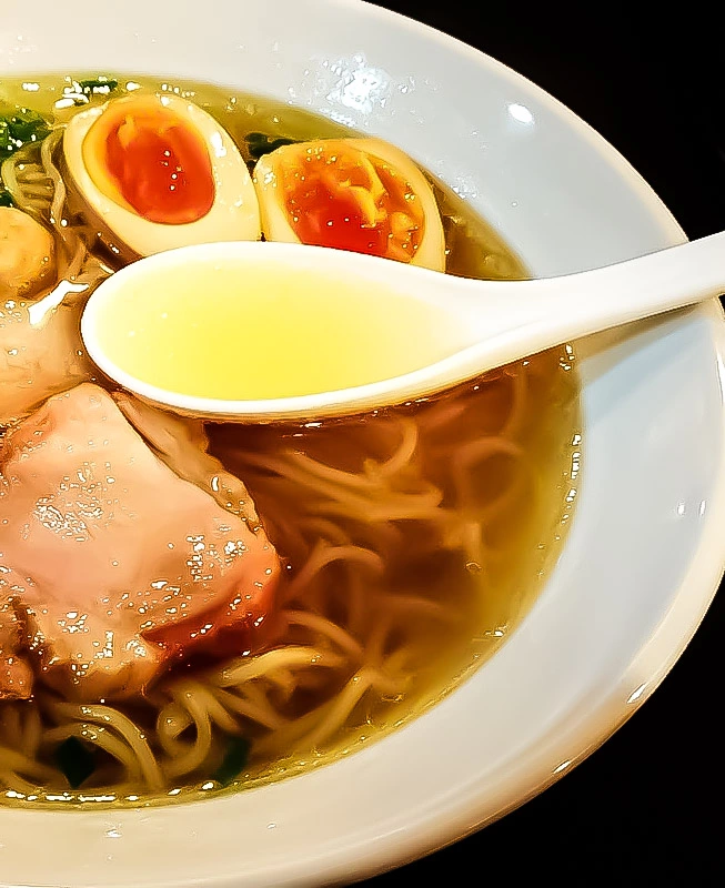 鶏と魚介、動物系のバランスに優れたクリアで旨味十分なスープ。