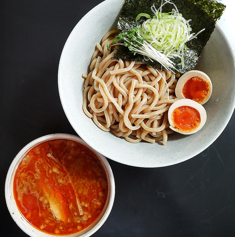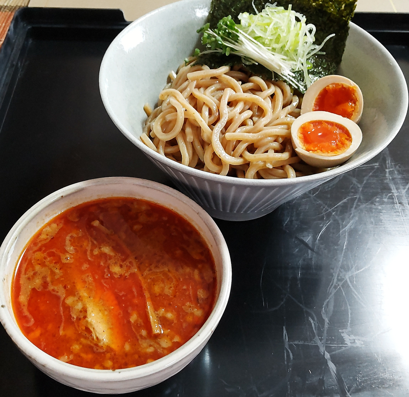 追加トッピングは九条ネギと味玉と海苔。麺は風味豊かな太麺ストレート、モチっと食感で美味い。具材はトロトロで柔らかいチャーシュー2枚とメンマ、いずれも良かった。つけ汁は動物系の旨味や、もちろん野菜の旨味や甘みをしっかり堪能出来る上等なもの。エビパウダーが強めのアクセントとして効果的に効いており、時折顔を出す柚子の風味もまた良い。辛味はそれなりにしっかり刺激があるが、それでも普通の豚骨魚介系よりも美味くて、少しでも体に低負担なら文句ない。