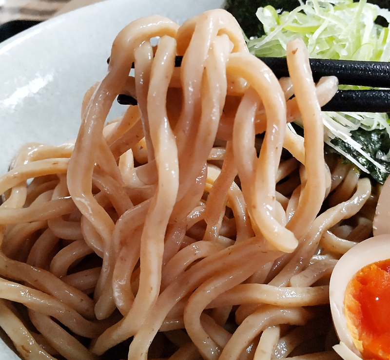 出汁はこうじグループや六厘舎のような魚粉節系が強いタイプと異なる豚・鶏・魚介のバランス型で、つけ麺によくある砂糖みりん酢などの調味料による人工的な甘味酸味はなく、豚背脂と野菜類の自然で優しいほのかな甘味旨味が感じられるもの。あっさりし過ぎず適度な油分で、極太麺との釣り合いが取れています。