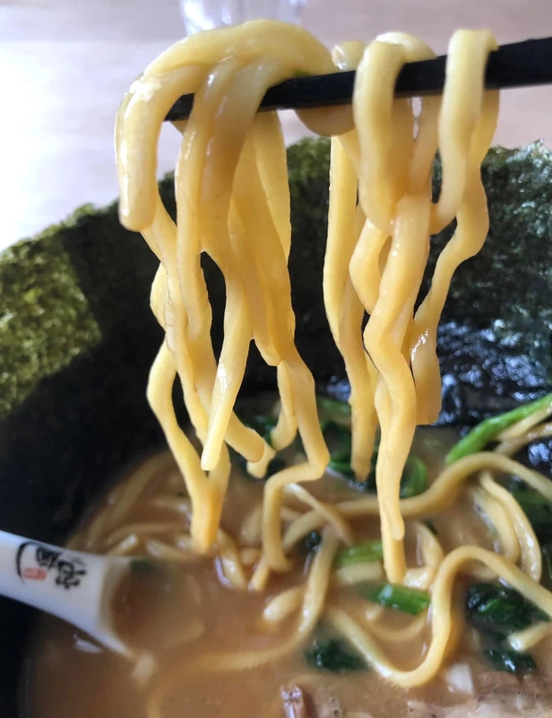 家系特有の短くカットされた麺(150g)は、平打ちの中太麺でコシがあって好み。