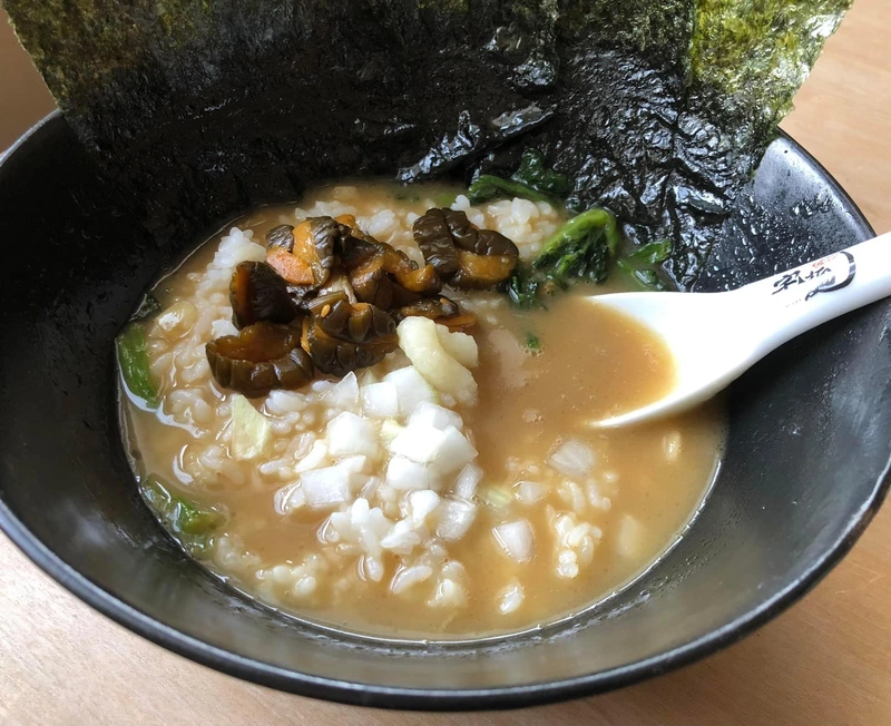 スープにライスを投入し、さらにおろしニンニクとキュウリのキューちゃんを追加して、スープに浸した海苔でライスを巻き巻きして食べます。