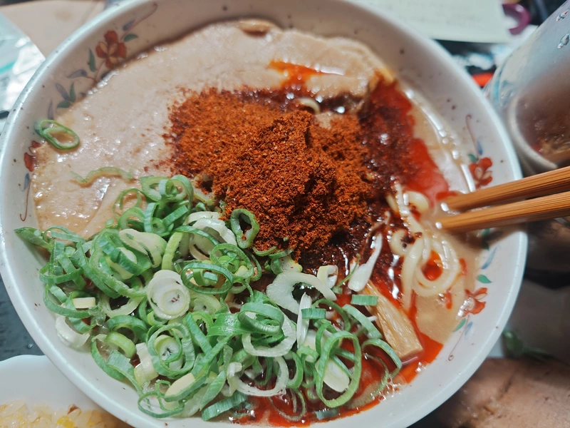 麺はもうすこし個性があってもいいかもしれないと思ったが、やはり魚粉系辛旨スープがおいしい。付属で真っ赤な粉がついてきてラーメンの辛さを調節できる。それもほかの料理やラーメンに入れることもできるほど粉の量がある。今残っている赤い粉が無くなったらまた注文したい。