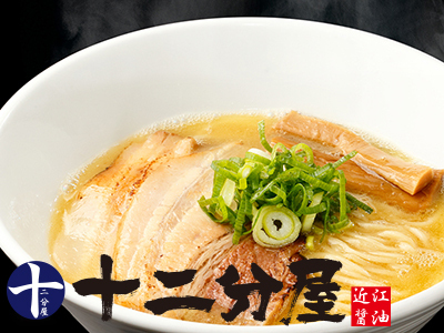 とことん醤油にこだわり、地元滋賀の醤油を使用したラーメンで人気を博す「近江熟成醤油ラーメン 十二分屋」。遠藤醤油『千登勢』濃口醤油に、10時間以上炊き込んだ濃厚鶏白湯スープと、魚介スープをプラスした重厚な旨味の一杯!