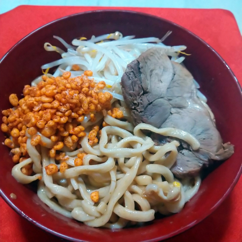 麺は、ムッチリとしながらなめらかな口当たりの超極太平打ち麺!!