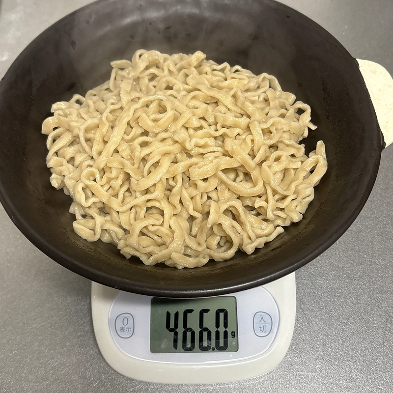 麺量は茹で前で210g 茹で後は340gと一人で食べ切るにはちょうどいい麺量で、他の二郎系と比較すると少し見劣り。