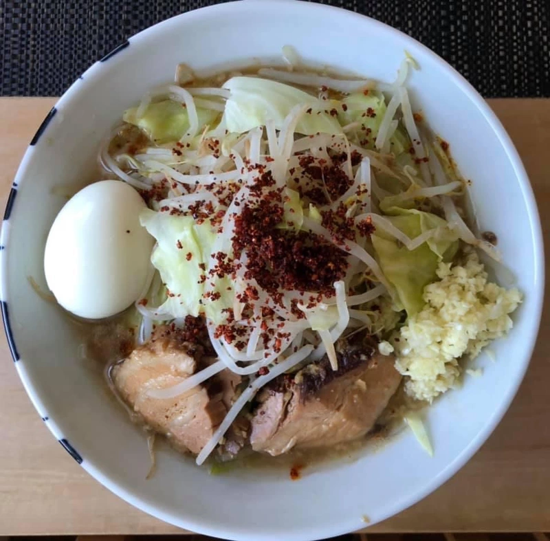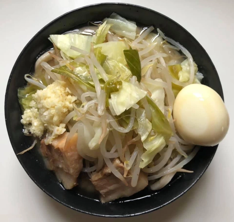 ヤサイアブラマシニンニクマシマシに、自作のカラメとゆで卵をトッピング。