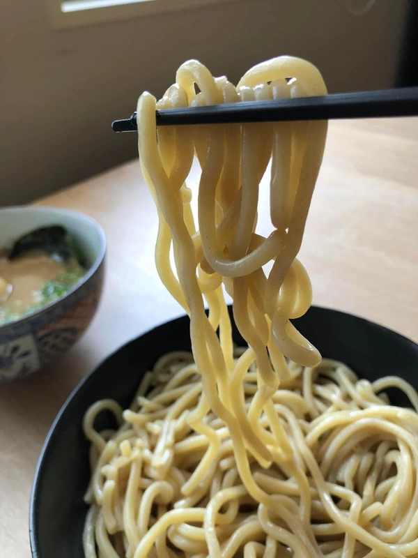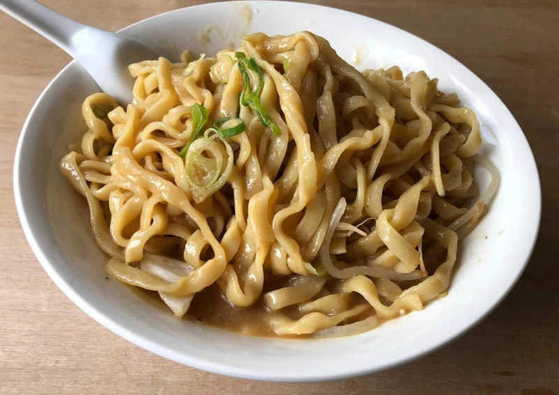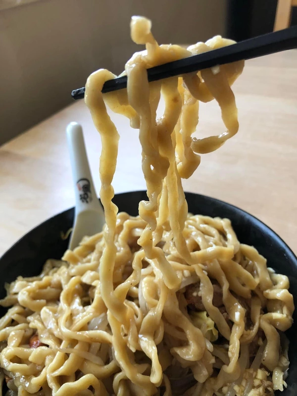 麺はモッチモチで風味が良く、平打ちの極太ちぢれ麺がタレをよく掴んでくれます。