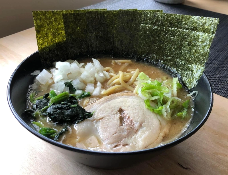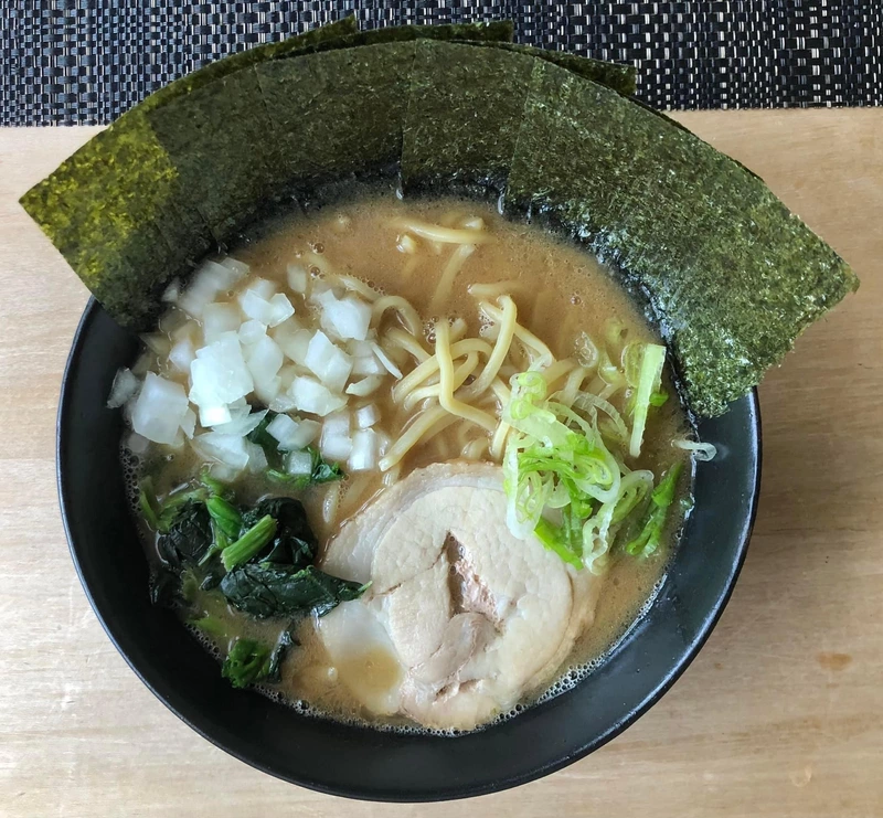 トッピングは魚粉、海苔、メンマと厚角切りチャーシューで、ネギと味玉を追加。