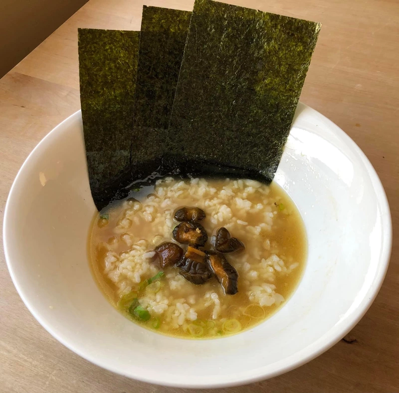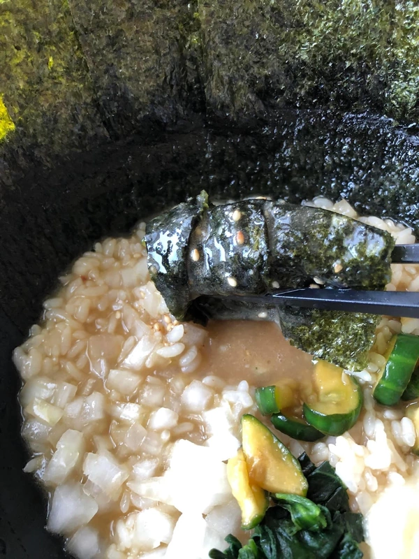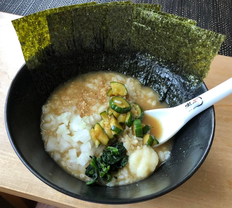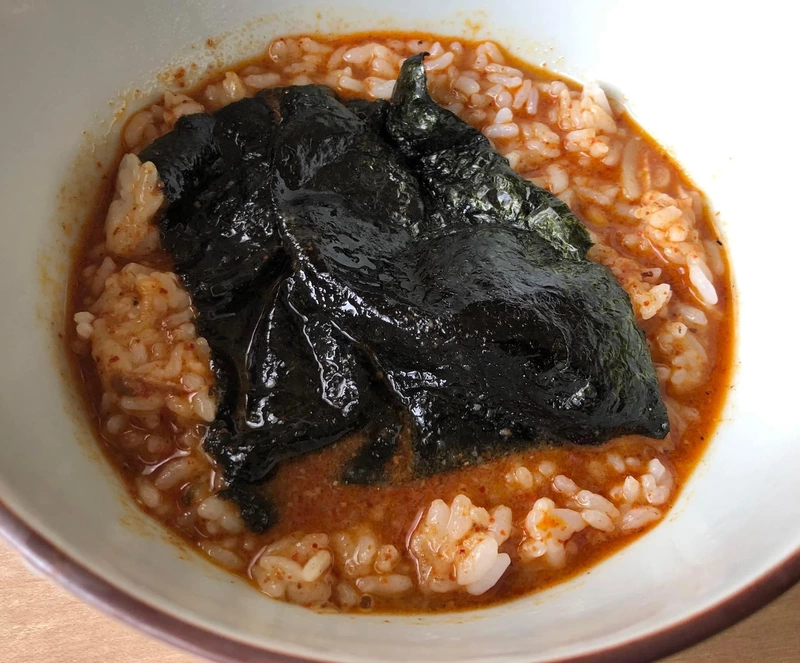 スープに浸した大判海苔でライスとキュウリのキューちゃん風漬物を巻き巻きして食べる。最高です。