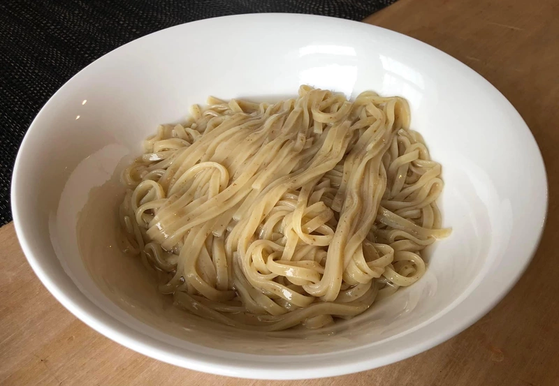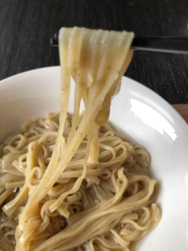 風味良い平打ち麺はツルッツル、コシもしっかり。これが、微かに塩気がある昆布水に絡まって、麺の味が引き立つ。