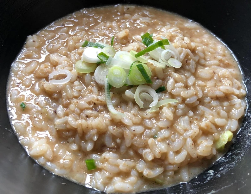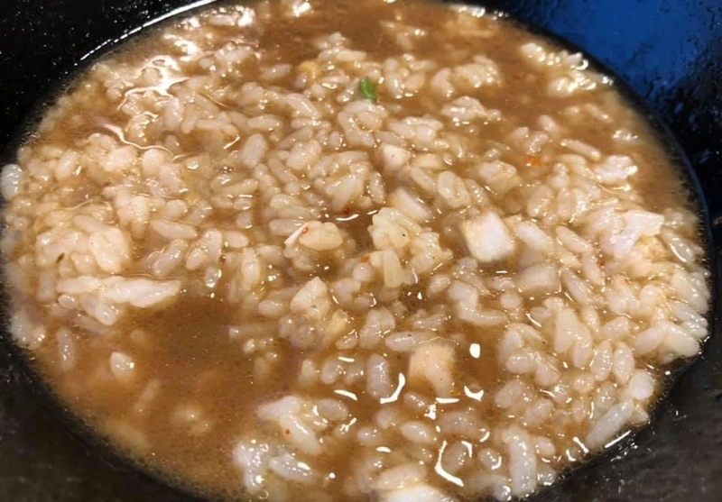 最後は、残った(頑張って残した)スープを鍋に戻して、このために炊いたご飯を投入して〆のおじやをまで堪能。