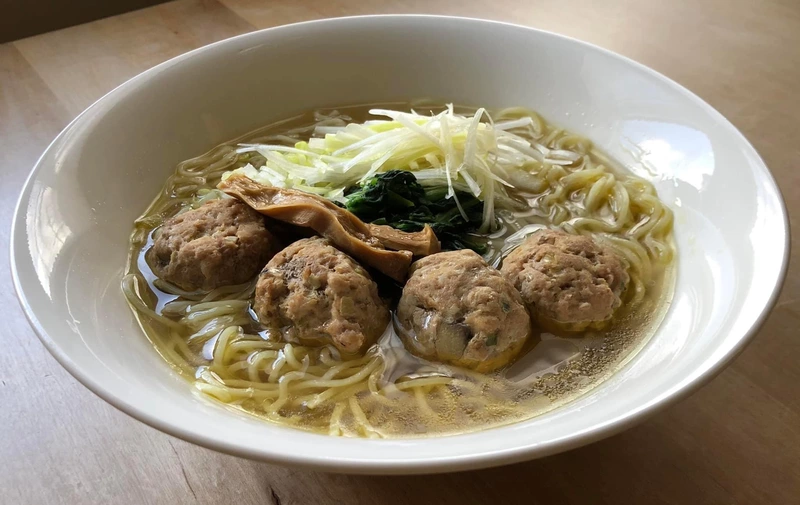 具材はボリューム満点の熊野地鶏のつみれ。これに、自前でほうれん草と白髪ネギを追加。