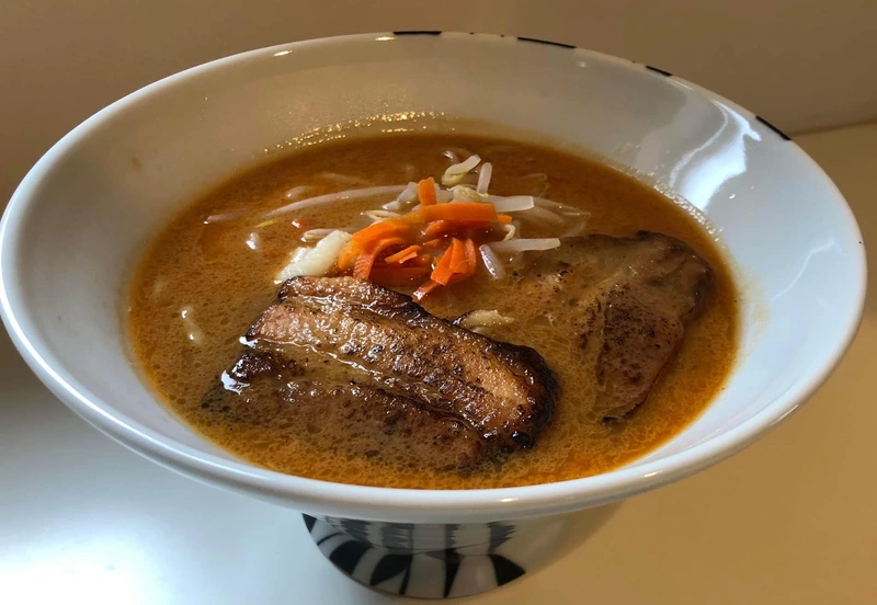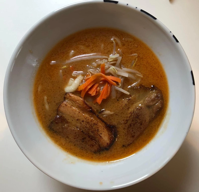 トッピングは分厚い焦がしチャーシュー2枚。もやしと人参、すりおろしニンニクは自前。