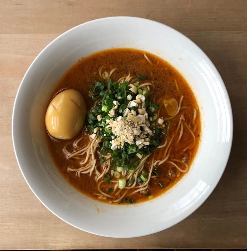 具材は肉味噌がゴロゴロ。自前トッピングはネギと自家製カラメに漬けた味玉。