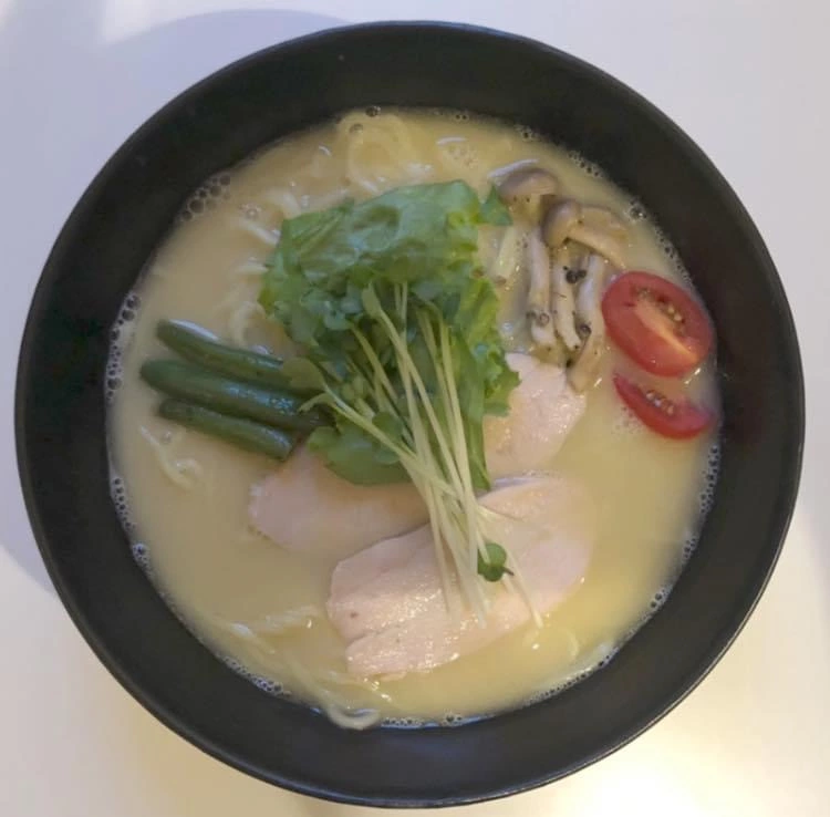 トッピングは付属の鶏チャーシュー2枚に、レタス、貝割れ、トマト、いんげん。
