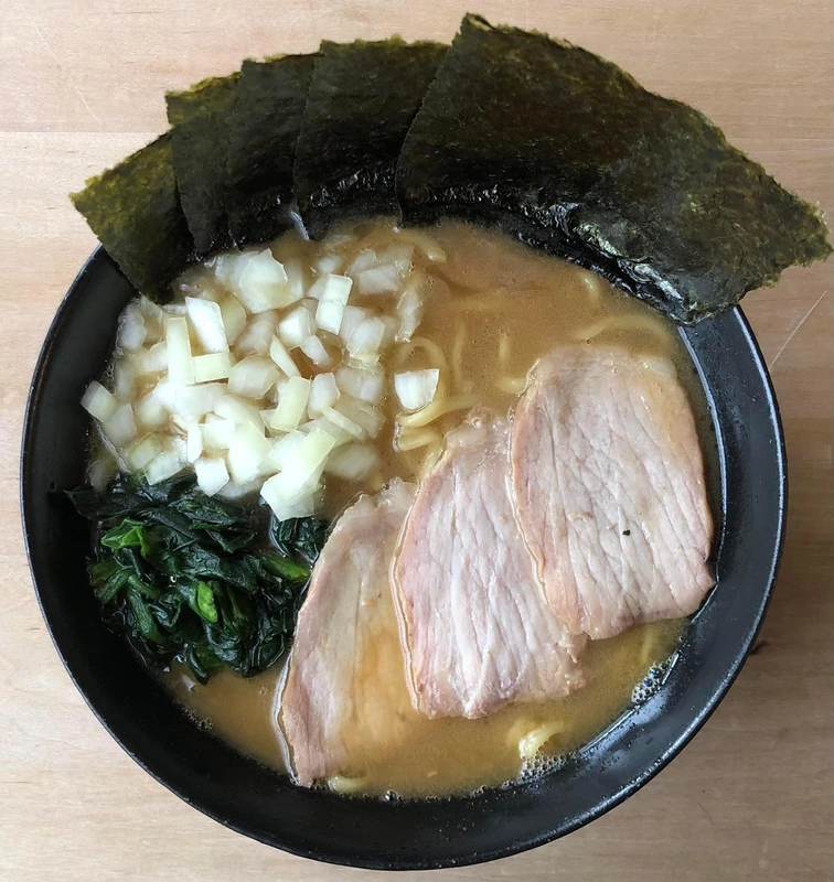 トッピングはチャーシュー3枚、大判海苔5枚に、刻みタマネギ、ほうれん草。