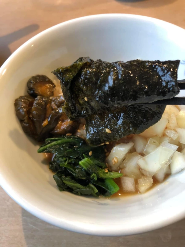 醤油の濃い味に疲れたら、ほうれん草や刻みタマネギで舌をリセット。