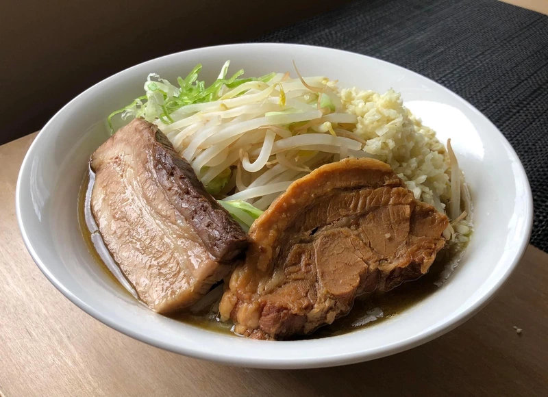 ヤサイマシニンニクマシマシアブラマシカラメに、自家製ブタを追加。