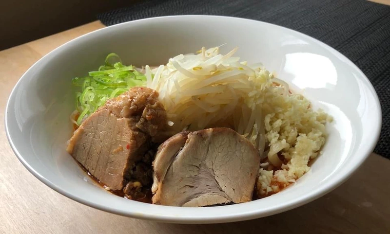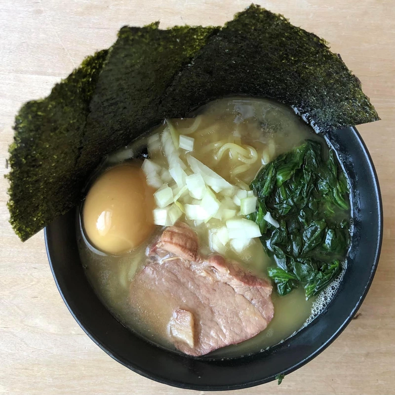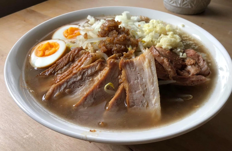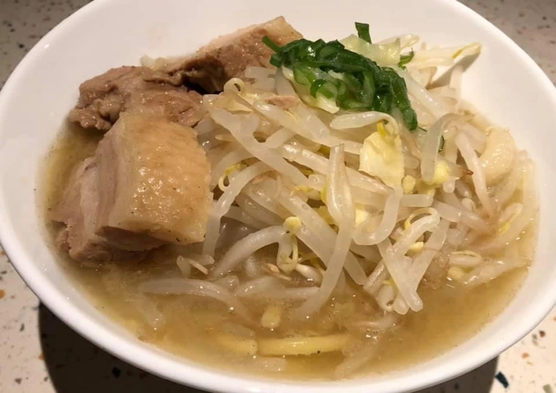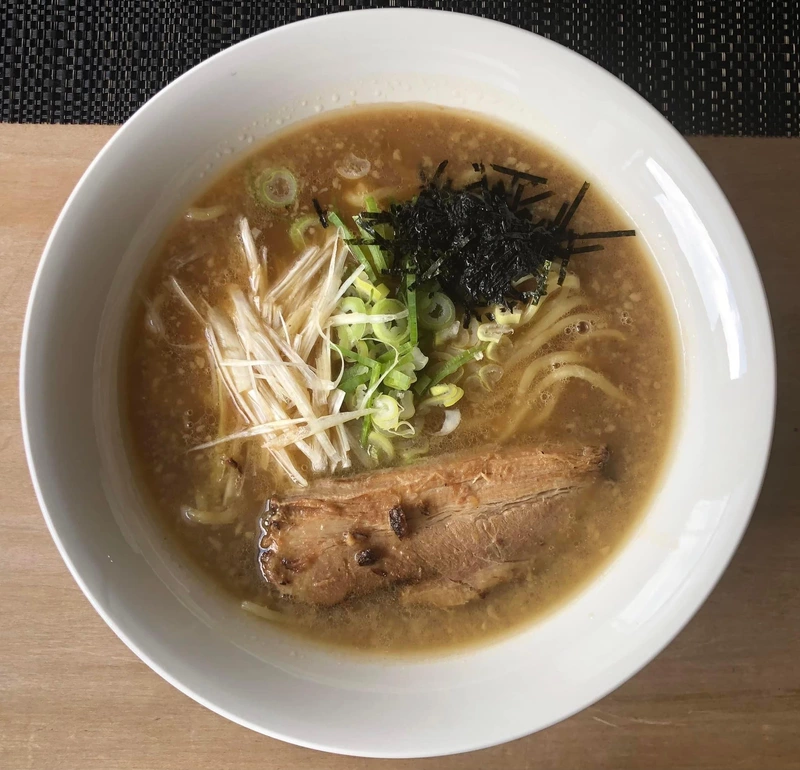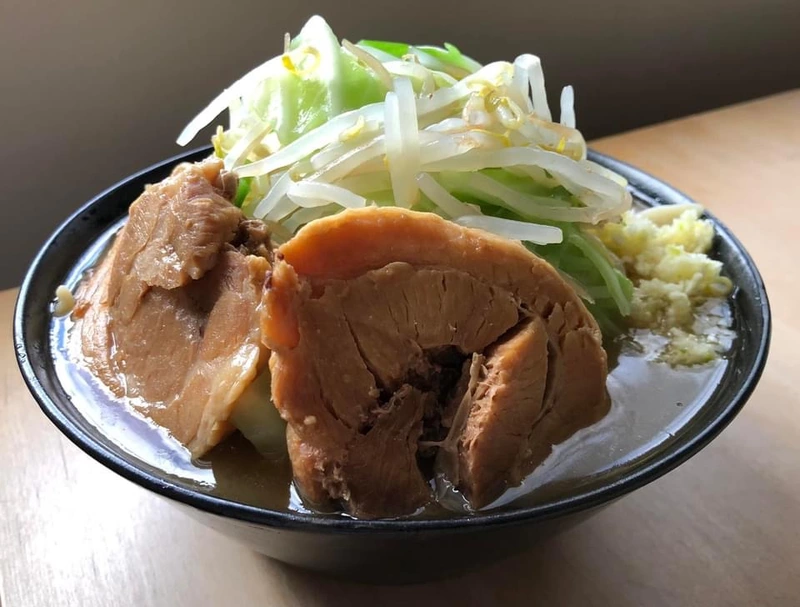スープは豚ガラ・鶏ガラに、大量のニンニクやタマネギなどを煮込んだベジポタ系。