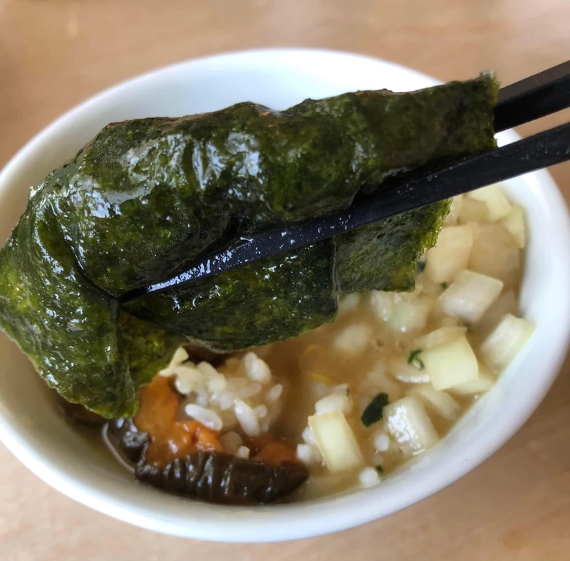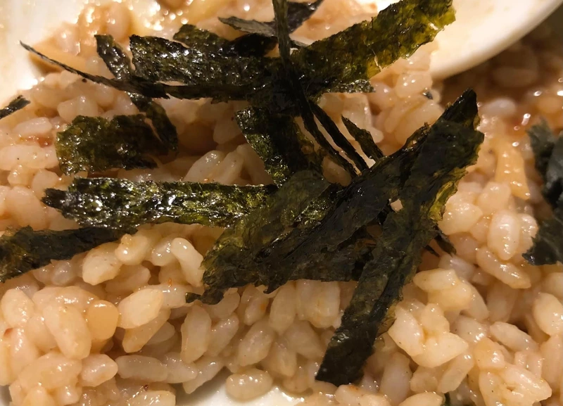 ライスにスープを投入してタマネギ、ほうれん草、ニンニクもオンザライス。ライス割り用に残していた4枚の海苔を、一旦スープに浸して柔らかくした後、ライスを巻き巻き。至福の瞬間です。