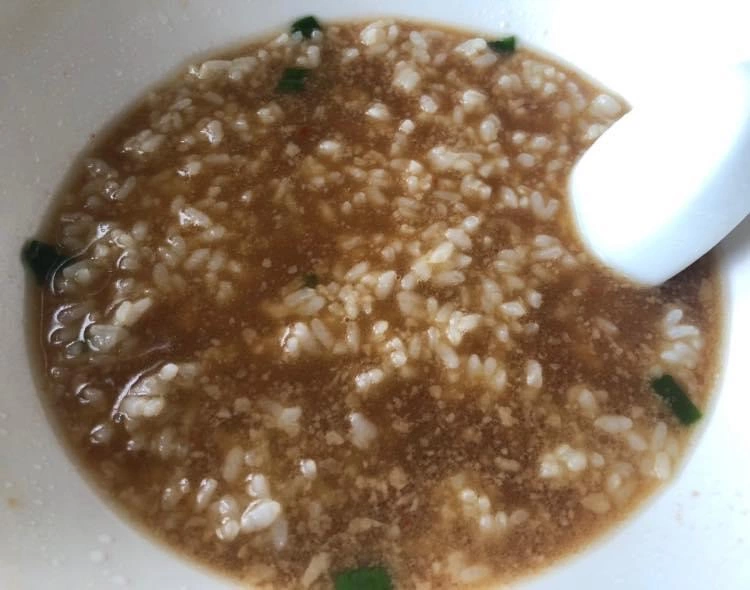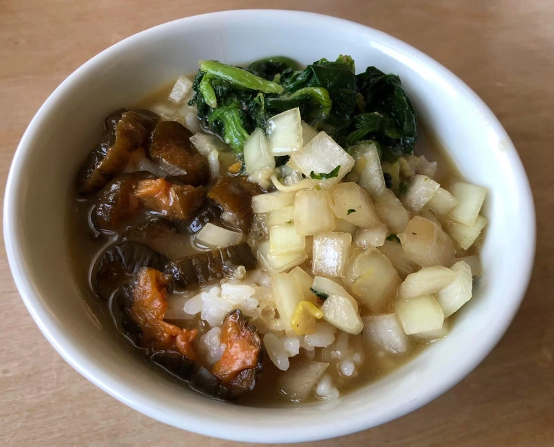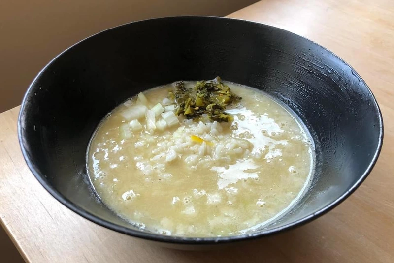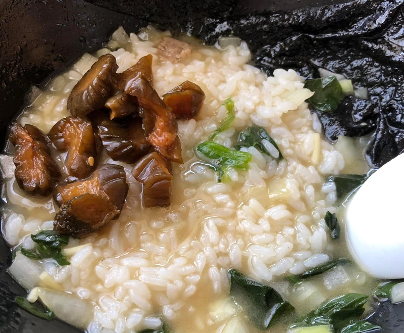最後はスープを鍋に戻してライスを投入し、高菜と刻みタマネギを散らせば、おじやの完成。