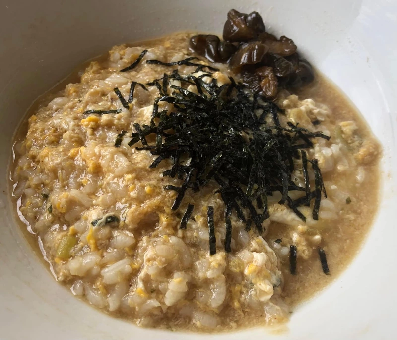 最後に、とき卵で閉じた雑炊を作って、もみ海苔と、いつでも家系を食べられるように常備しているきゅうりのキューちゃんと一緒にかっこんで完食完飲。