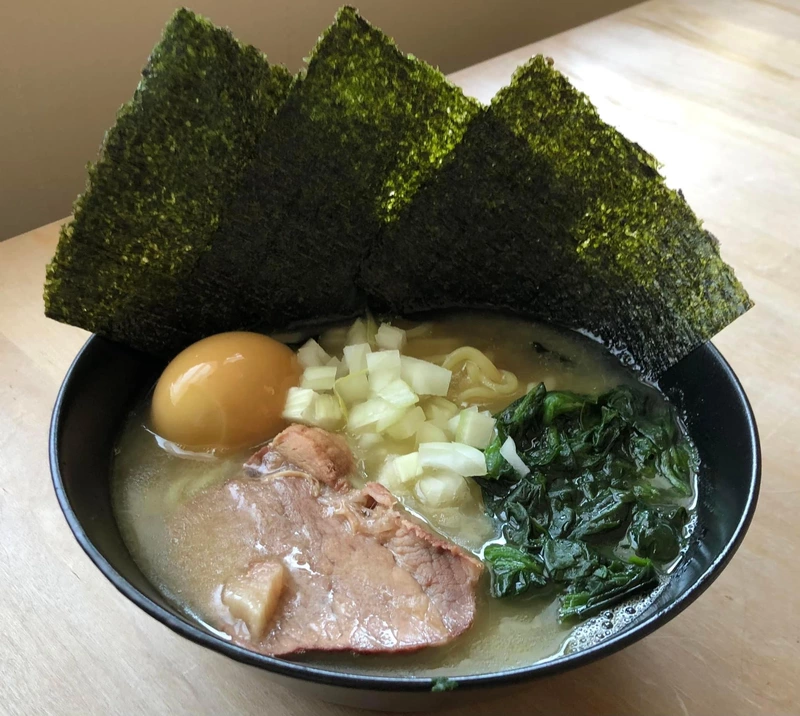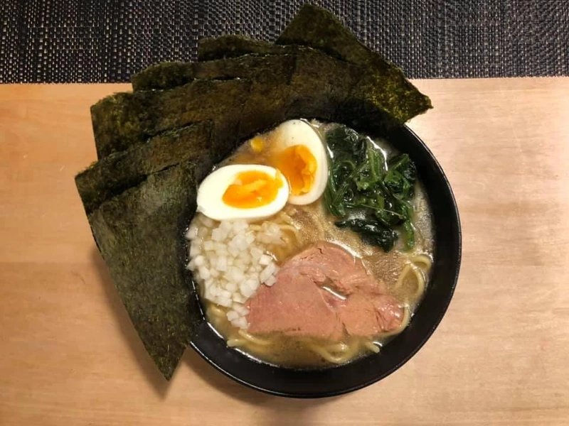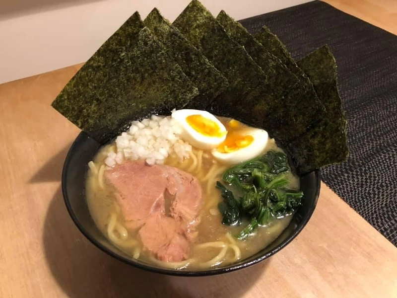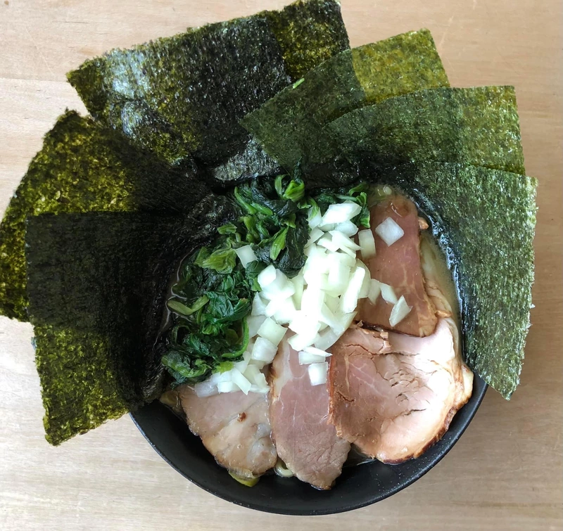 ほうれん草、焼豚、海苔10枚は付属で、刻みタマネギとゆで卵は自前で。