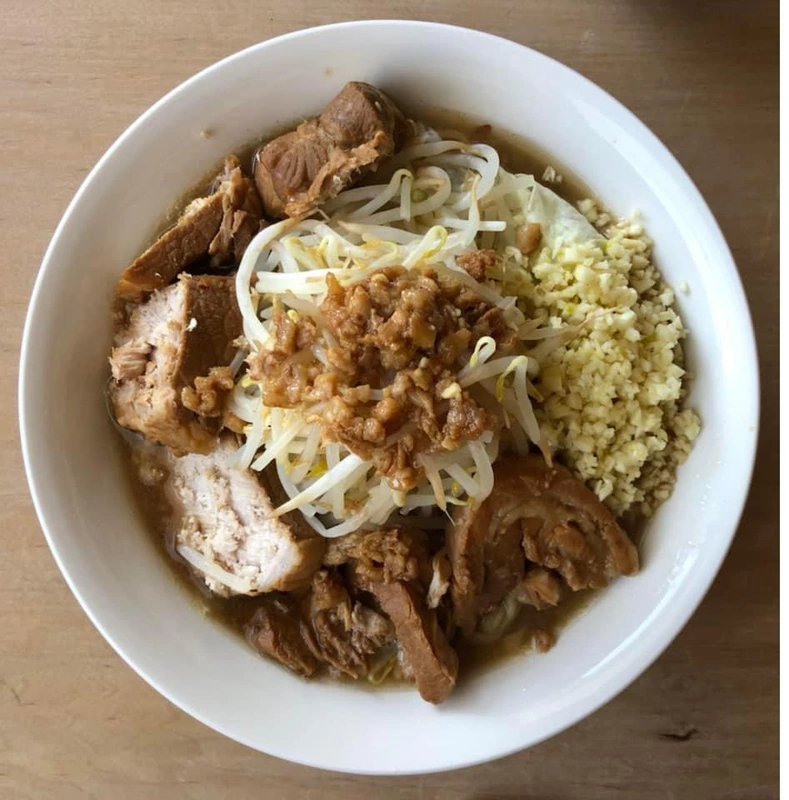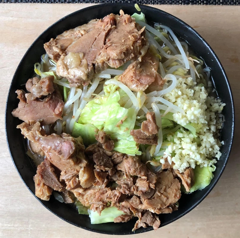 ニンニクマシマシヤサイアブラマシネギトッピングでいただきます。