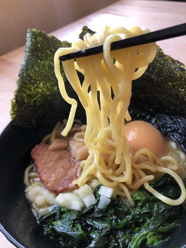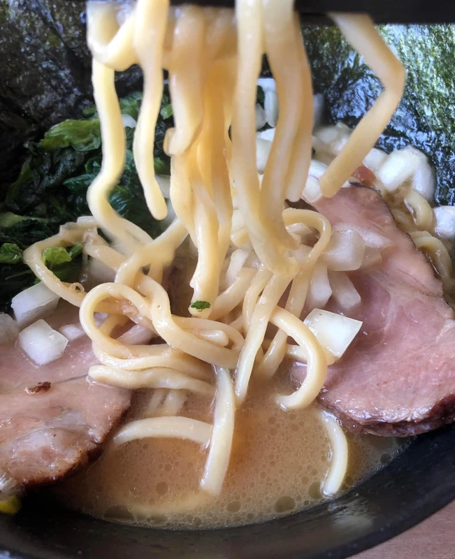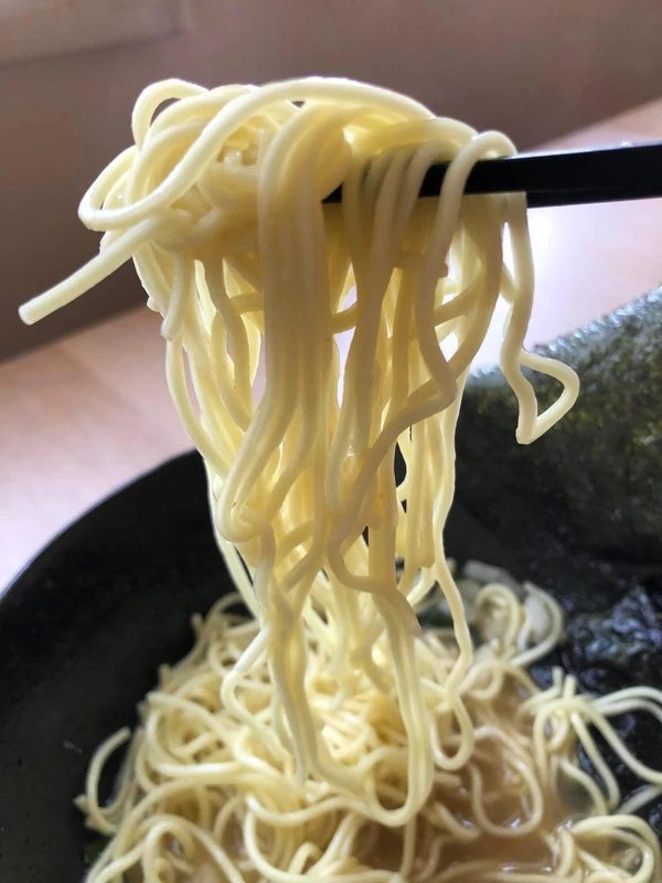 家系特有の短い麺(150g)は、平打ちでコシがあるパッツンパッツン麺。