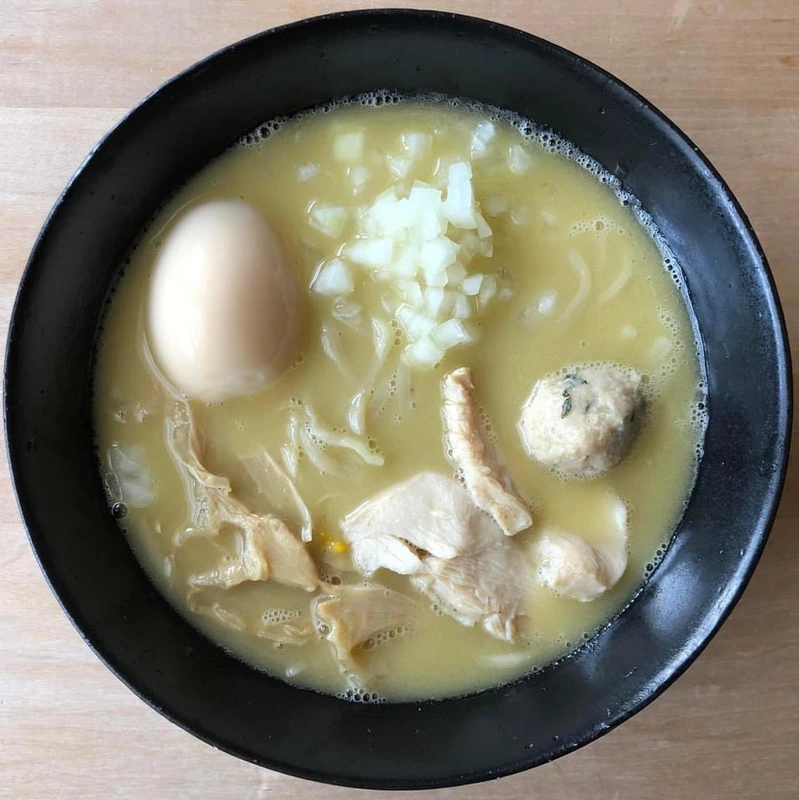 トッピングは、付属の鳥チャーシューと鳥団子、穂先メンマ。