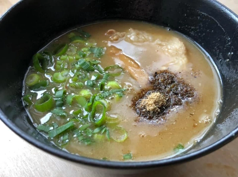 魚介系と動物系の出汁に、5種類の赤味噌がブレンドされたスープはそのままで絶品。味噌由来の辛味を感じます。