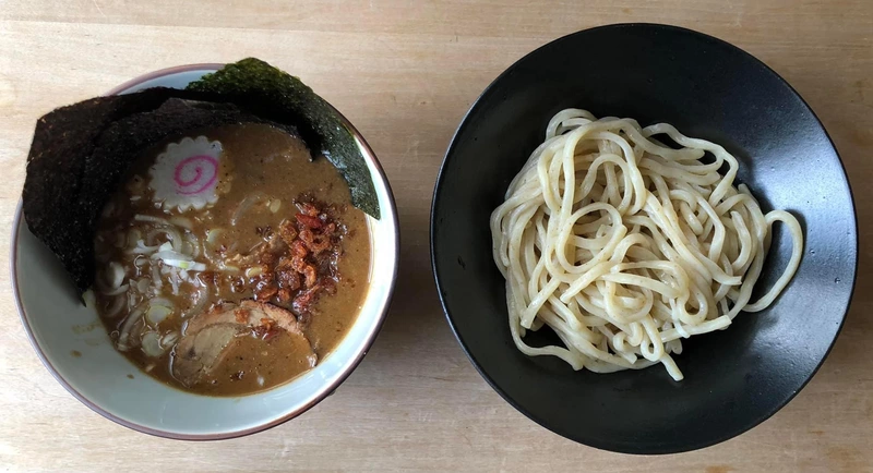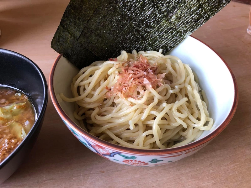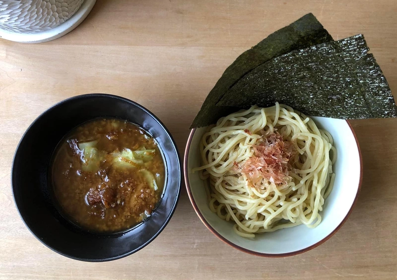 「燕三条系ラーメン」を東京風にアレンジしたつけ麺で、茹でキャベツ、海苔、鰹節、味玉を自前でトッピング。