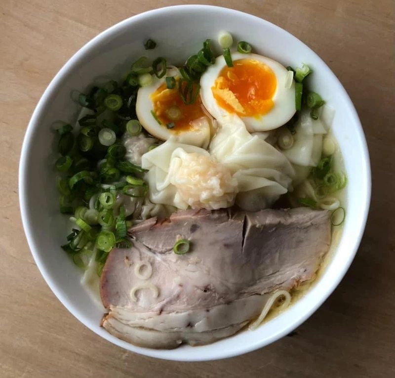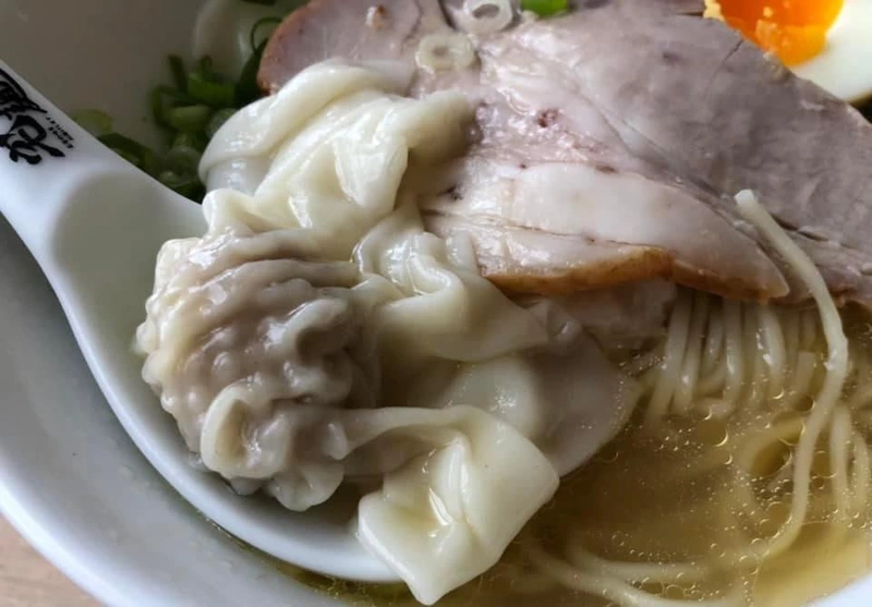 そこに、大判チャーシューと、大振りな肉ワンタンと海老ワンタンが3個ずつ。自家製カラメに浸した味付玉子とネギのみ追加トッピング。そして何よりこの海老ワンタンが激ウマ。