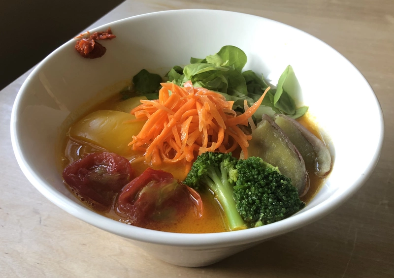 間違いなく賛否両論あるスープですが、付属の赤い柚子胡椒を溶かしながら辛味が増してくると、不思議とラーメン感が強くなる。そこに、キャロットラペの酸味や野菜の味わいが徐々に合わさって、実に面白い。ま、アリですな。