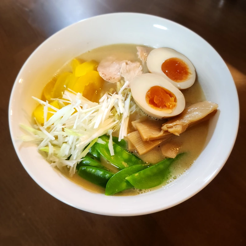 子供が生まれたばかりで、お店には食べに行けず念願の煮干し。強烈な煮干しのガツンと来る旨味が最高。ほどよい苦味がなんとも言えない。チャーシューもとろとろでとても美味しい。お店の濃厚と比べると若干とろみや濃厚さが弱い気がした