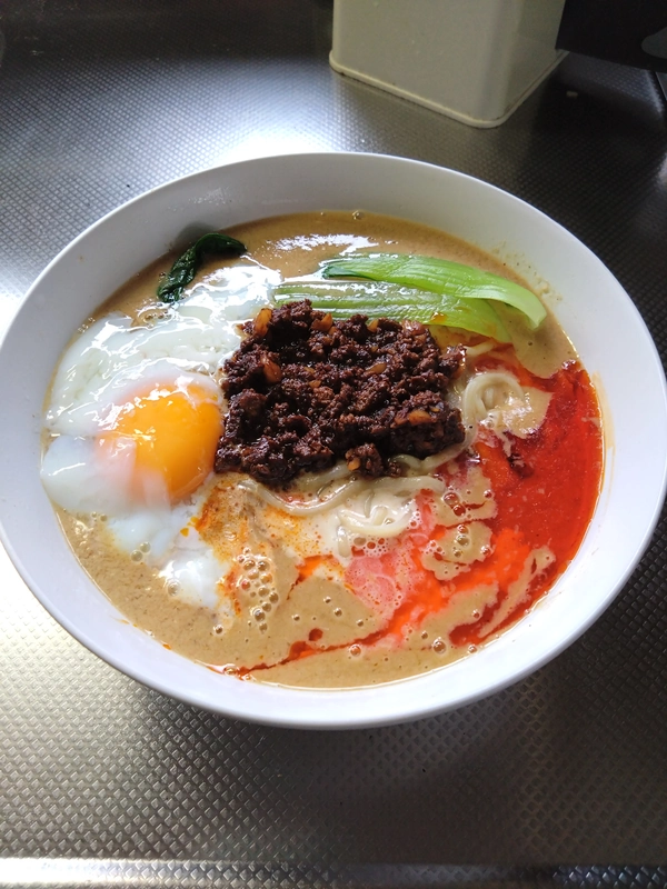 胡麻ベースのスープ、辣油、ホワイトソース、肉味噌を少しずつ混ぜて味の変化を楽しませていただきました。オススメの残ったスープに🍚も堪能して大満足の一品でした。