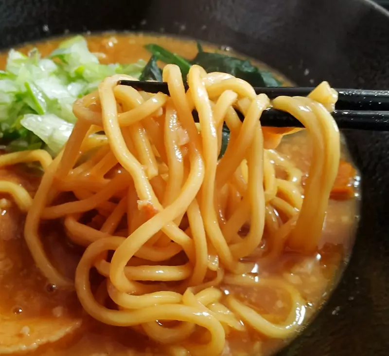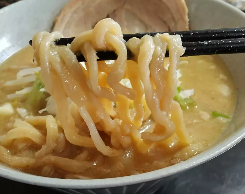 麺は中~太縮れ。