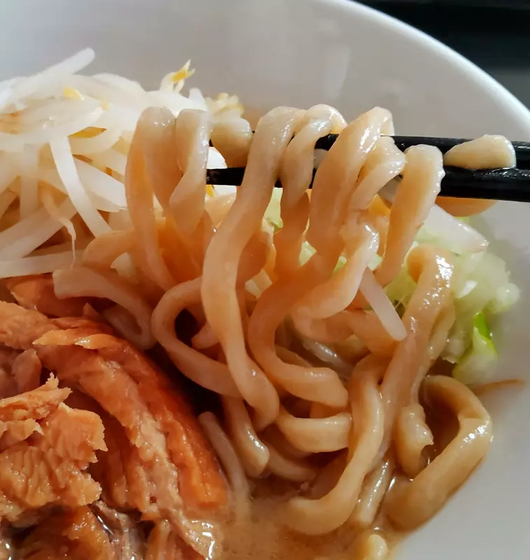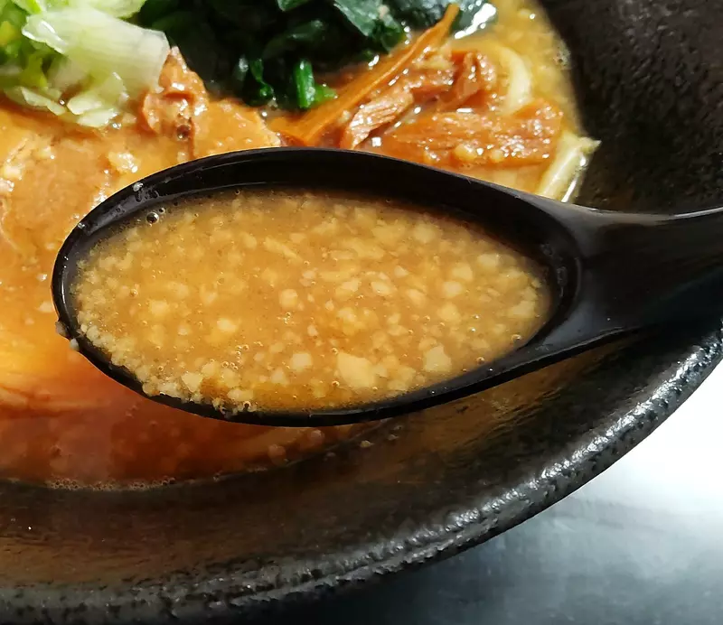 魚粉を入れる前は、少しピリ辛な野菜と魚介豚骨の風味で、野菜の旨味を感じる濃厚クリーミーなスープ。 魚粉を全投入すると、一気にまたおま系の味わいにシフト。