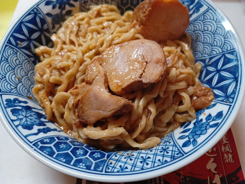 ラー油ダレを入れて、一味パウダーを少量入れたらもう激辛。でも、美味い!ちゃんと豚魚系の旨味あるつけ汁です。辛味が入ると癖になる味わい。
