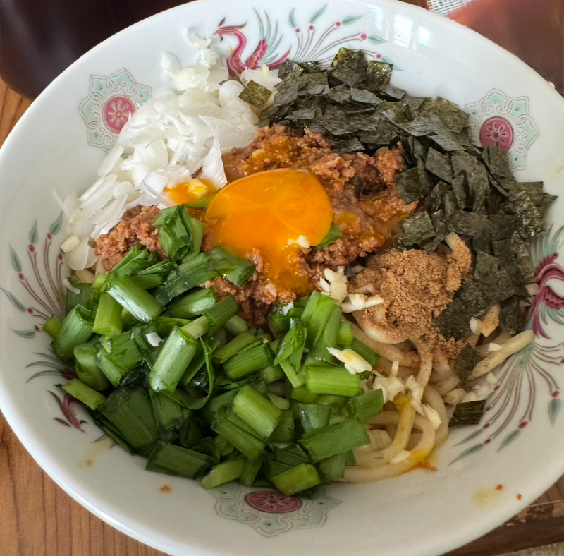 もちもちして食べ応えのある麺に魚粉と辛肉ミンチが絡みそこにニンニクの風味やニラ、ねぎが合わさって美味しすぎて夢中で食べました。
