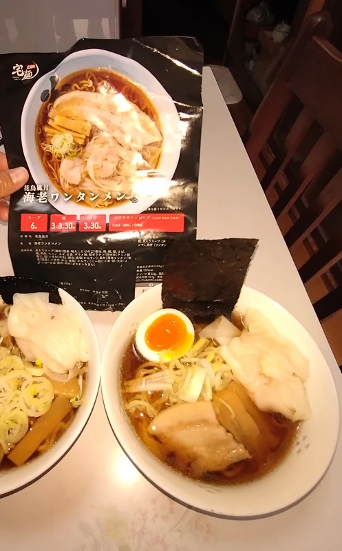 えびがそのまま入ったワンタン2個の皮がかなり美味しくて大変満足です。チャーシューわメンマも入っており、麺スープとの相性も、ばつぐんです。追加で玉子と海苔、ねぎでいただきました。(画像は他の宅配麺との味比べの為、1つを2杯にして注いでます。)