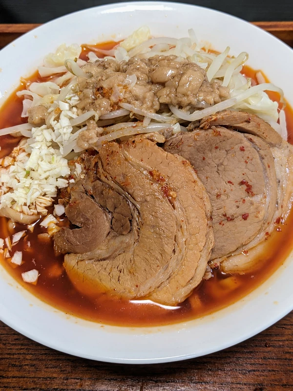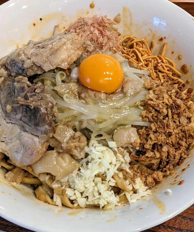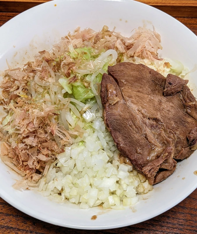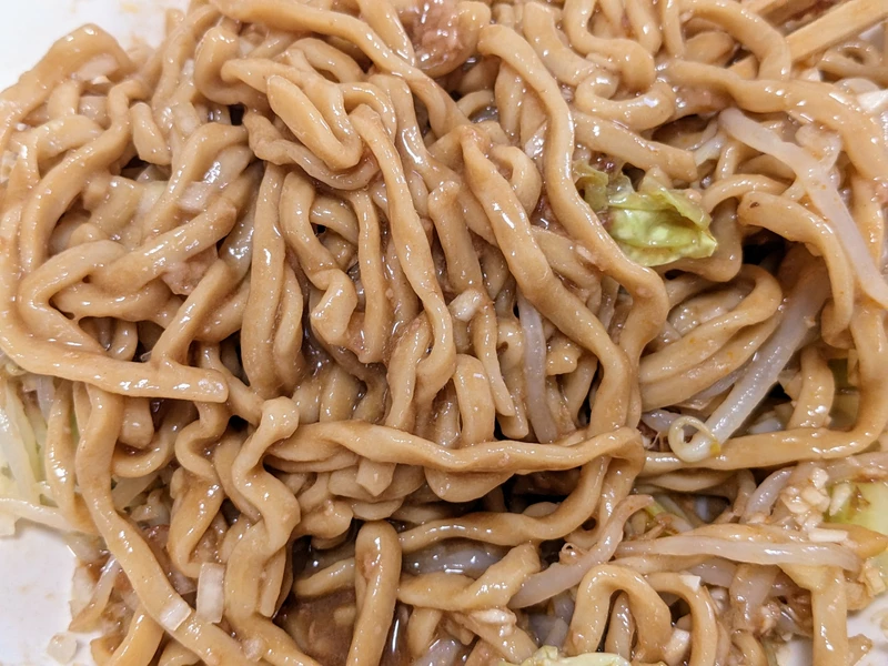 二郎系でも汁なしやまぜそばはヤサイ入れると味が薄まるというかボケてしまうのでヤサイは少なめなんなら抜きでもいいかなと思います。