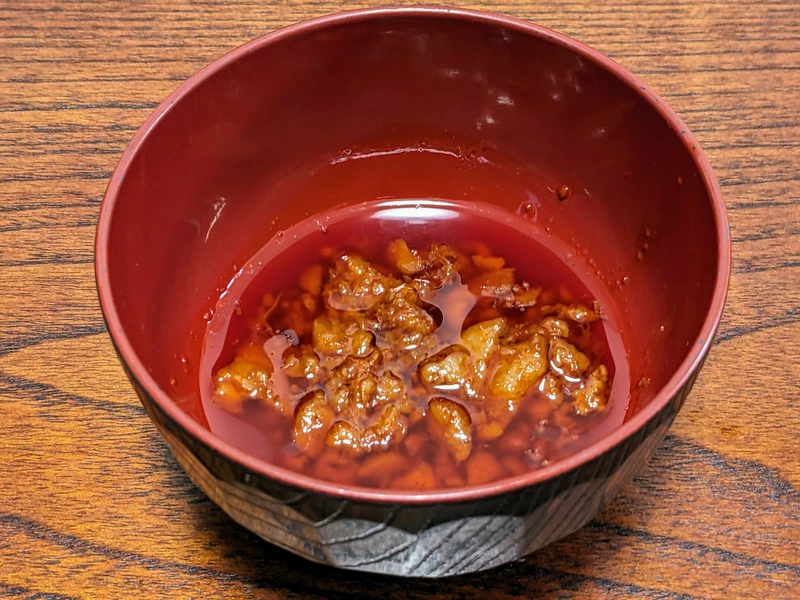味付き脂はしょっぱさ控えめ、ヤサイに乗せて食べるもよしお椀に入れてディップして食べるもよし。