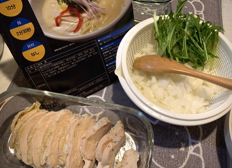 今回はトッピングのために自家製鶏チャーシューを用意(その他にタマネギと水菜も)