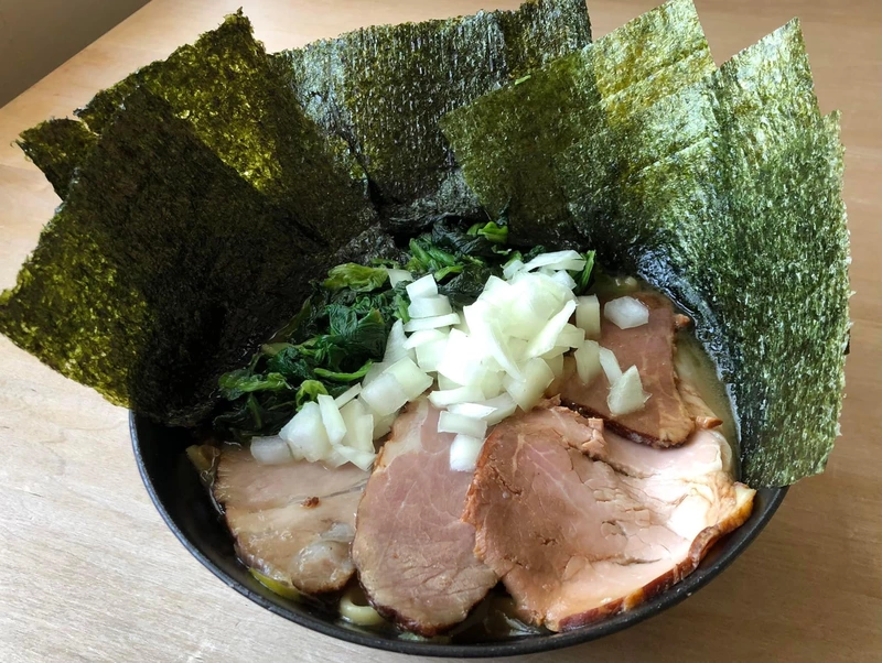 刻みタマネギと海苔3枚、ほうれん草少しと焼豚2枚を自前で追加。