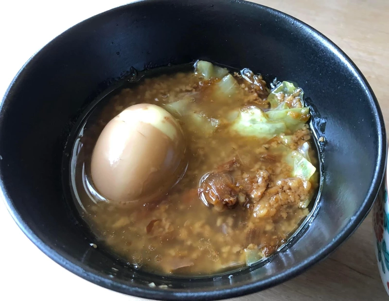 「燕三条系ラーメン」を東京風にアレンジしたつけ麺で、茹でキャベツ、海苔、鰹節、味玉を自前でトッピング。