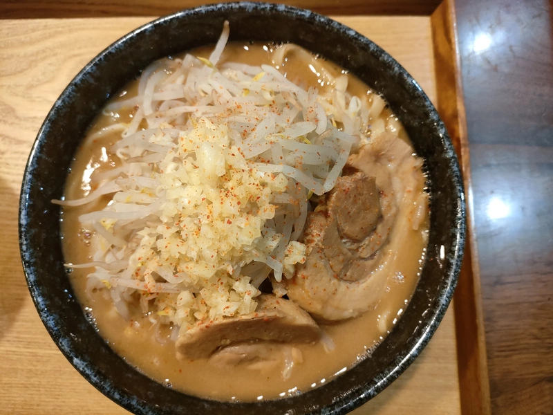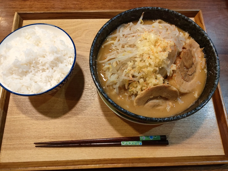 ド乳化スープに二郎系特有のオーション麺、極厚神豚、必須トッピングの野菜と刻みニンニク。もうそれだけで他では味わえないうまさ! 箸が止まりません。