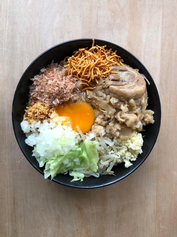 ヤサイニンニクアブラマシ、トッピングは付属のベビースター、フライドオニオン、かつお節に加え、茹でもやし・キャベツと刻みタマネギ、ニンニク、卵を準備。