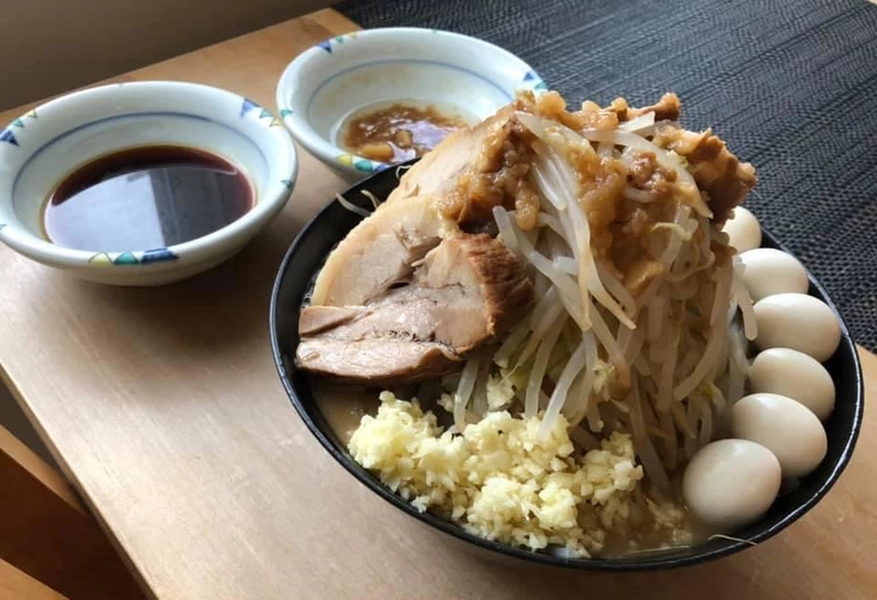 自分で準備したヤサイとニンニクもマシマシにして、ウズラもトッピング。アブラ、カラメは別皿にしました。